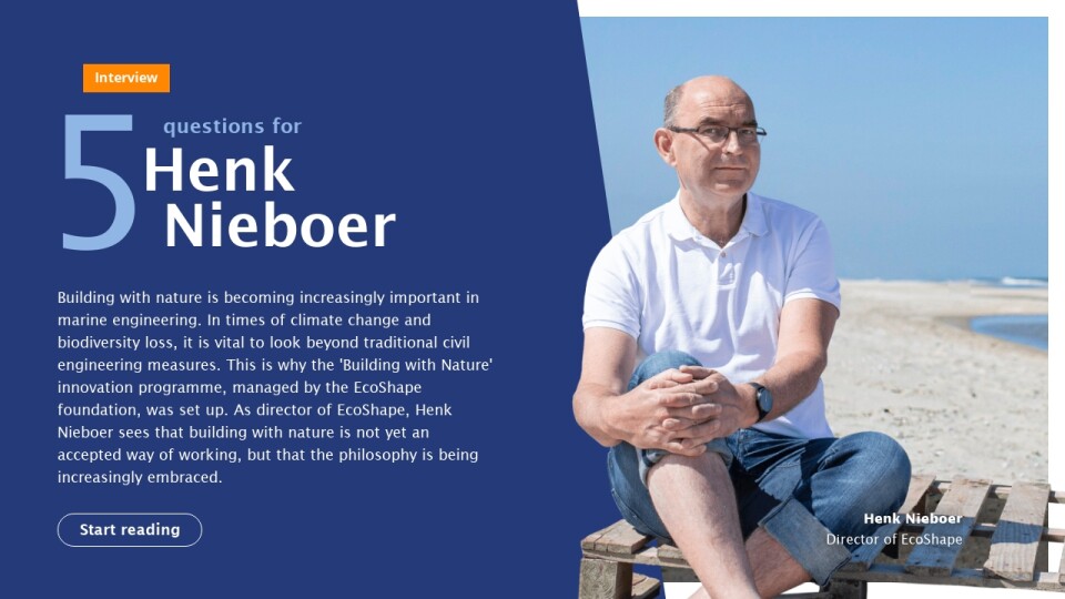 Building with nature is becoming increasingly important in marine engineering. In times of climate change and biodiversity loss, it is vital to look beyond traditional civil engineering measures. This is why the 'Building with Nature' innovation programme, managed by the EcoShape foundation, was set up. As director of EcoShape, Henk Nieboer sees that building with nature is not yet an accepted way of working, but that the philosophy is being increasingly embraced.